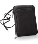 600D polyester. Hideaway adjustable neck cord.Smartphone compatible.Padded main compartment.Passport pocket.Organiser section.