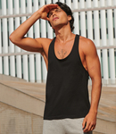 Single jersey. Self fabric bound neckline and armholes. Racer back style. Side seams. Longer length. Twin needle straight hem. Tear out label.