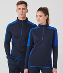 Wicking finish. Contrast zip neck with stand up collar. Contrast shoulder, upperarm and side panels. Concealed right zip pocket. Contrast stretch bound cuffs and hem. Tear out label.