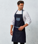 Easy care fabric. Contrast neck tie with adjustable metal buckle. Contrast fabric ties with metal eyelets. Reverse contrast denim centre chest pocket and pen pocket. Lower front pocket and pen pocket. Width 72cm. Length 86cm. Industrial laundry 85°C. Domestic wash 60°C.