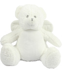 100% polyester. Soft plush white bear.Contrast eyes and nose.Fabric wings.Removable inner pad.Zip access for decoration onto front panel.Suitable for embroidery, print and sublimation.