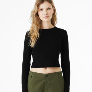 90% airlume combed ringspun cotton/10% polyester. Pre-shrunk. Fitted style. 1x1 micro rib. Bound neckline. Side seams. Cropped length. Tear out label.