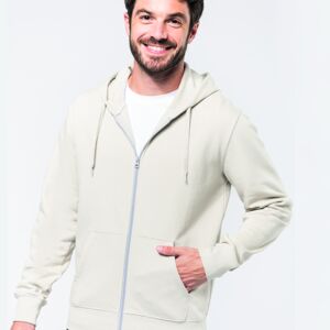 85% organic combed cotton/15% recycled polyester. Enzyme washed. Soft cotton faced fabric. Three yarn low shrinkage fleece. Brushed back fleece. Drop shoulder style. Straight fit. Jersey lined hood with self colour drawcord. Jersey taped neck. Half moon back yoke. Full length zip. Front pouch pockets. 1x1 ribbed cuffs and hem. Twin needle stitching. Unbranded size label.