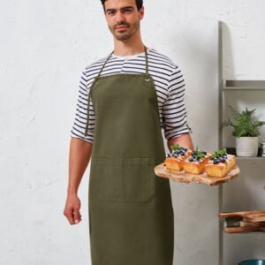60% cotton/40% recycled polyester CVC. Easy care fabric. Heavyweight canvas material. Eyelet detail for adjustable knotted neckband. Double front pocket. Eyelets with rounded corners. Self fabric 90cm ties. Width 72cm. Length 86cm. Can be worn as a full bib or half waist apron. Domestic wash 40°C.