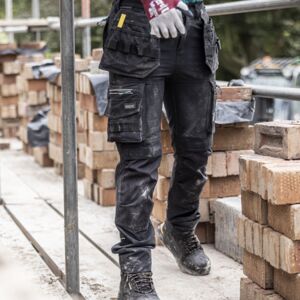 100% polyester. Made from at least 30% recycled polyester. Woven four-way stretch fabric. Water repellent finish. Part elasticated waistband with belt loops. Zip fly with button over. Detachable holster pockets with slide system for optional use. Two side pockets. Two rear pockets. Side leg multi-use cargo pockets with contrast zip pulls. Ripstop stretch fabric to outer thigh, lower leg and seat panels. Cordura® top loading knee pad pockets. Reinforced seams with triple stitching. Branded.
